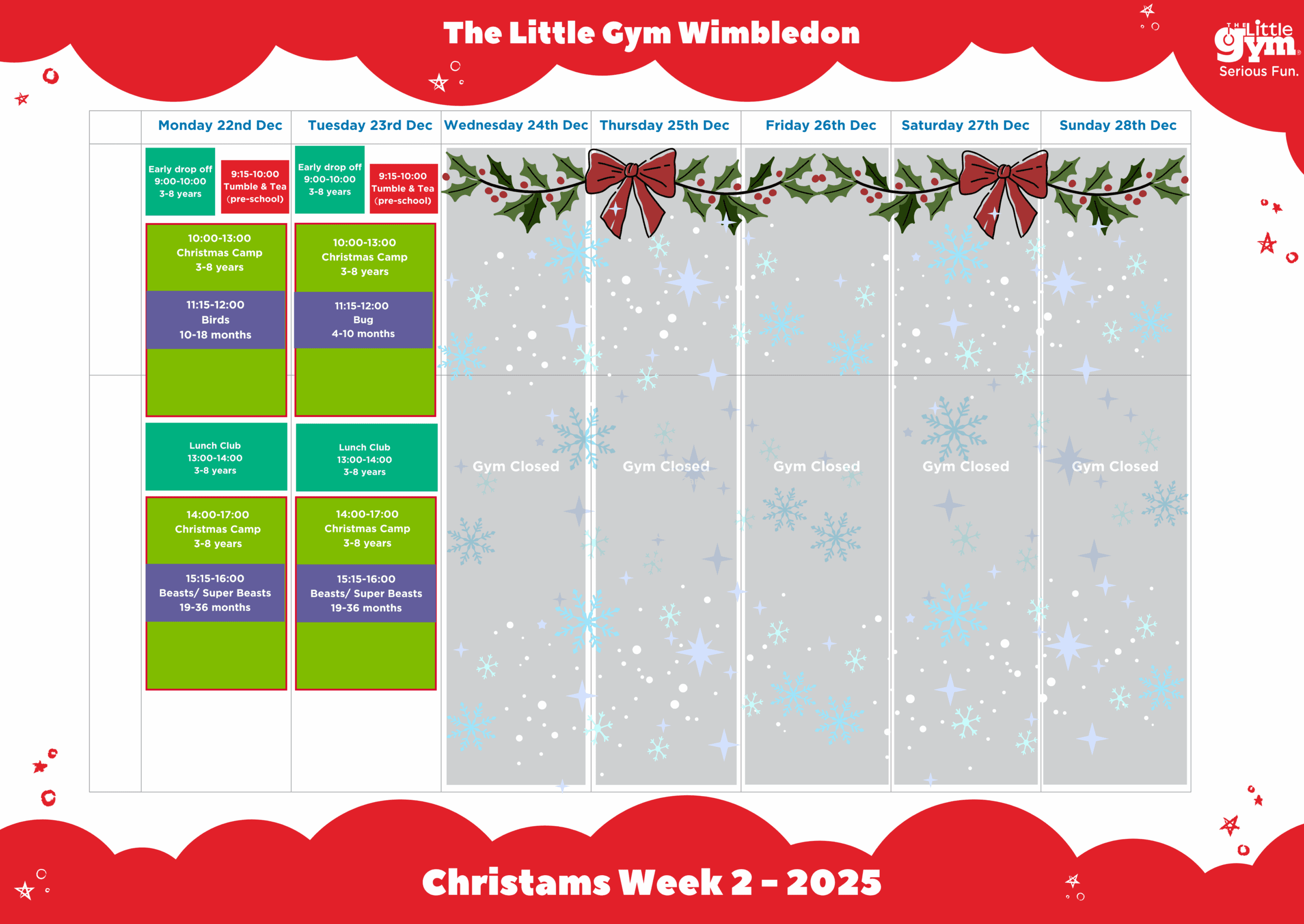 - 3 x added Holiday Camps on Monday & Tuesday for 3-8 years